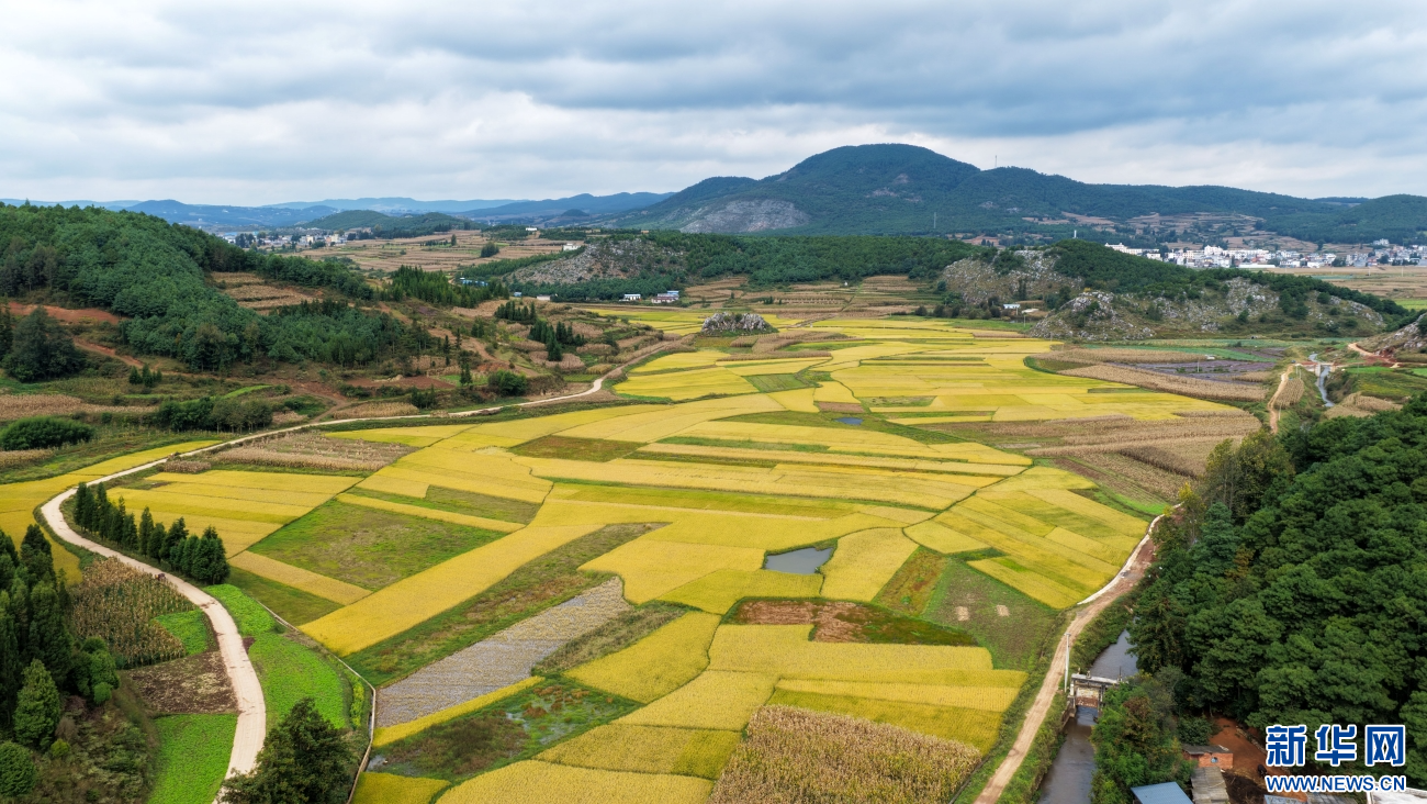 金秋时节,云南省曲靖市沾益区播乐乡乐利村“丰”景如画。在秋日大地的“调色盘”上,金黄色稻田呈条块状排列,与民居、绿树、山地、道路共同勾勒出一幅优美的田园丰收画卷。(孙文来)
