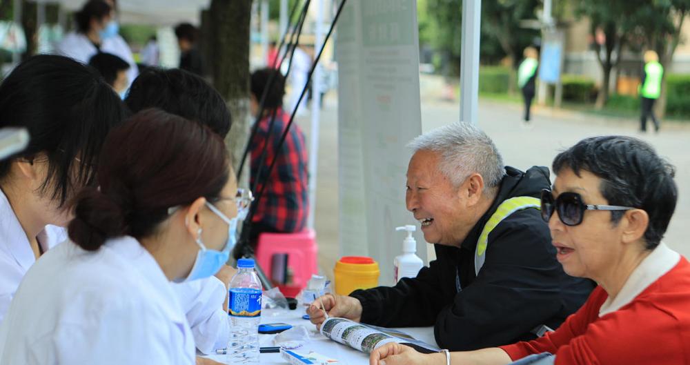 2025年昆明市 “敬老月” 启动仪式上,志愿者为老年人测血压、测血糖。记者 高吴双 摄
