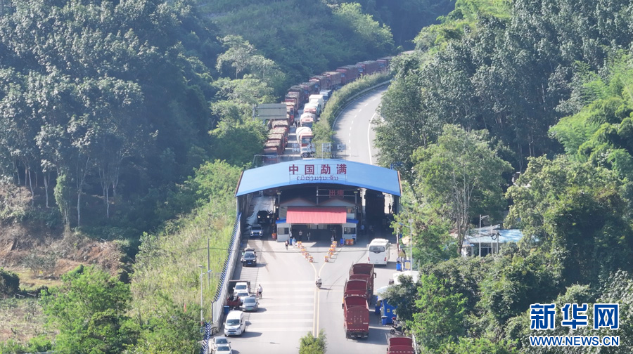 航拍勐满口岸入境满载甘蔗的车辆(10月29日摄)。新华网发(李扬 摄)