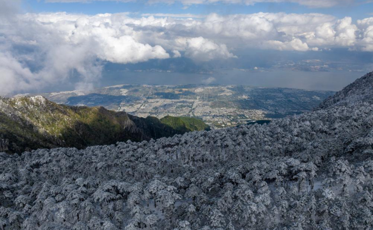 受冷空气影响,云南大理苍山迎来2025年入冬后的首场降雪。银装素裹的山林与山脚下的洱海、古城相映成趣,构成一幅水墨画卷。