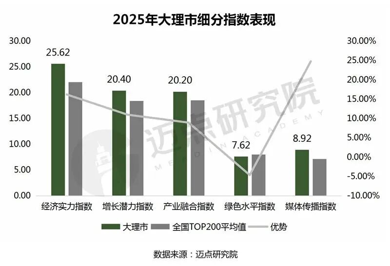 报告数据显示,大理CTDI总排名位列全国县域榜首。经济实力为25.62,远超平均,表明其文旅产业已形成强大的经济贡献和成熟的消费市场。增长潜力20.40,显著领先,显示其未来仍被持续看好,发展后劲充足。产业融合20.20,高于平均水平,证明其“文旅+”模式行之有效,产业链不断延伸。绿色水平7.62,略低于平均,这既是其作为热门旅游目的地面临的环保压力,也是其未来必须补强的关键短板。媒体传播8.92,占据绝对优势,是其最核心的竞争力之一,表明大理已成功占据公众心智,成为现象级的“网红”目的地。大理在四项关键指标上均大幅领先,尤其在媒体传播和经济实力上建立了“护城河”,其“全能冠军”的形象并非仅靠单一优势,而是综合实力的体现。