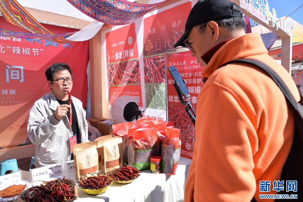 摊主向嘉宾推介丘北辣椒制品。新华网发(李溪岩 摄)