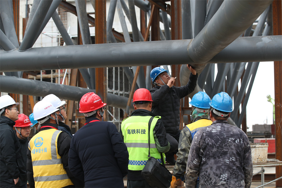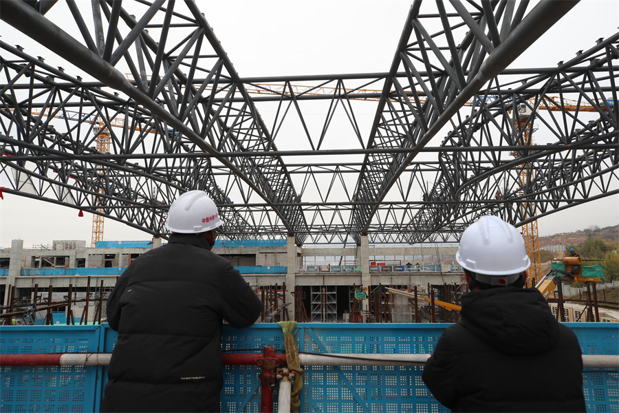 工作人员观察屋面钢桁架(12月4日摄)。张广玉 摄