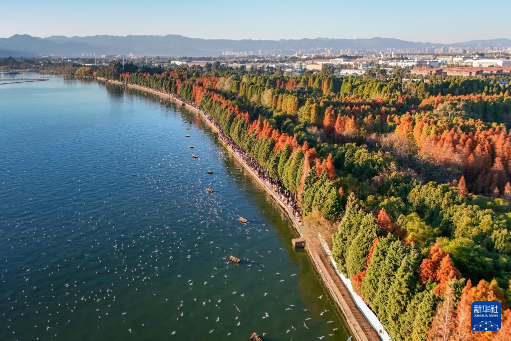 12月10日,游客在滇池畔的海洪湿地公园喂红嘴鸥(无人机照片)。新华社记者 彭奕凯 摄