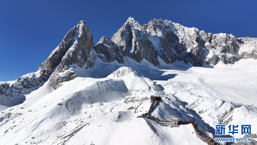 冬日里的云南省丽江市玉龙雪山,澄澈蓝天与皑皑白雪相互映衬,远处山峦叠嶂,云雾缭绕,宛如一幅山水画,美不胜收。(完)(范芳钰 李浩)