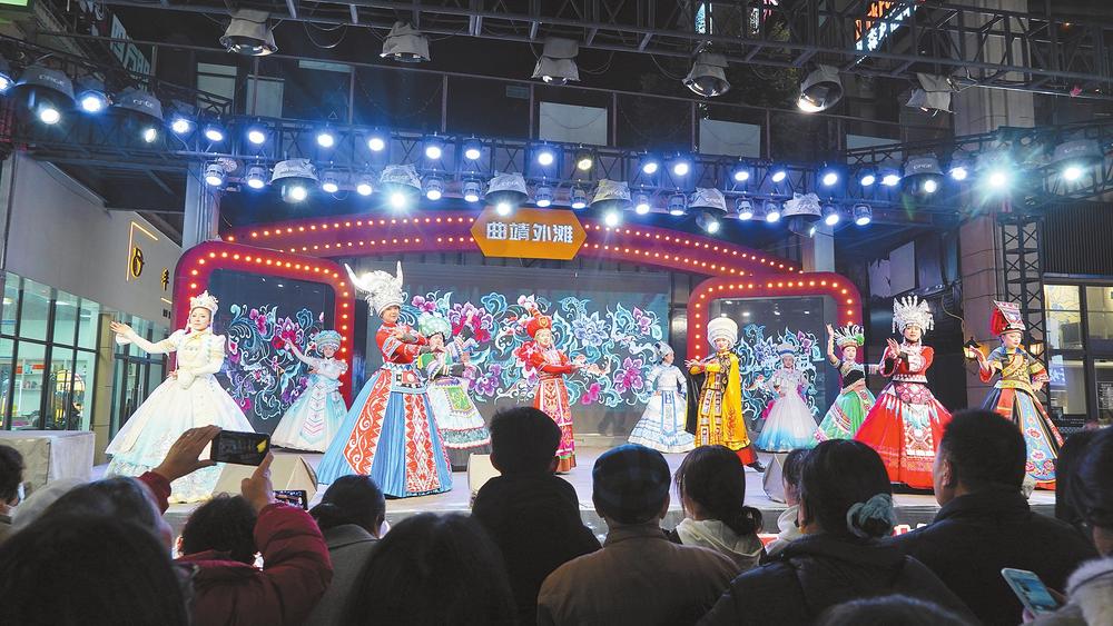 晚上7时,曲靖外滩的民族广场上音乐欢快,身着彝族、苗族等各色服饰的舞蹈队伍成为一道流动的风景线。不远处,长达1500米的步行街上灯火通明,各种烧烤的香气弥漫在空中。