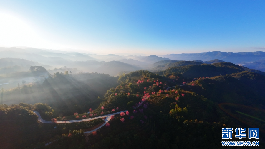 盛开的冬樱花将茶园装点得如诗如画(2025年12月31日摄)。新华网发(刘子安 摄)