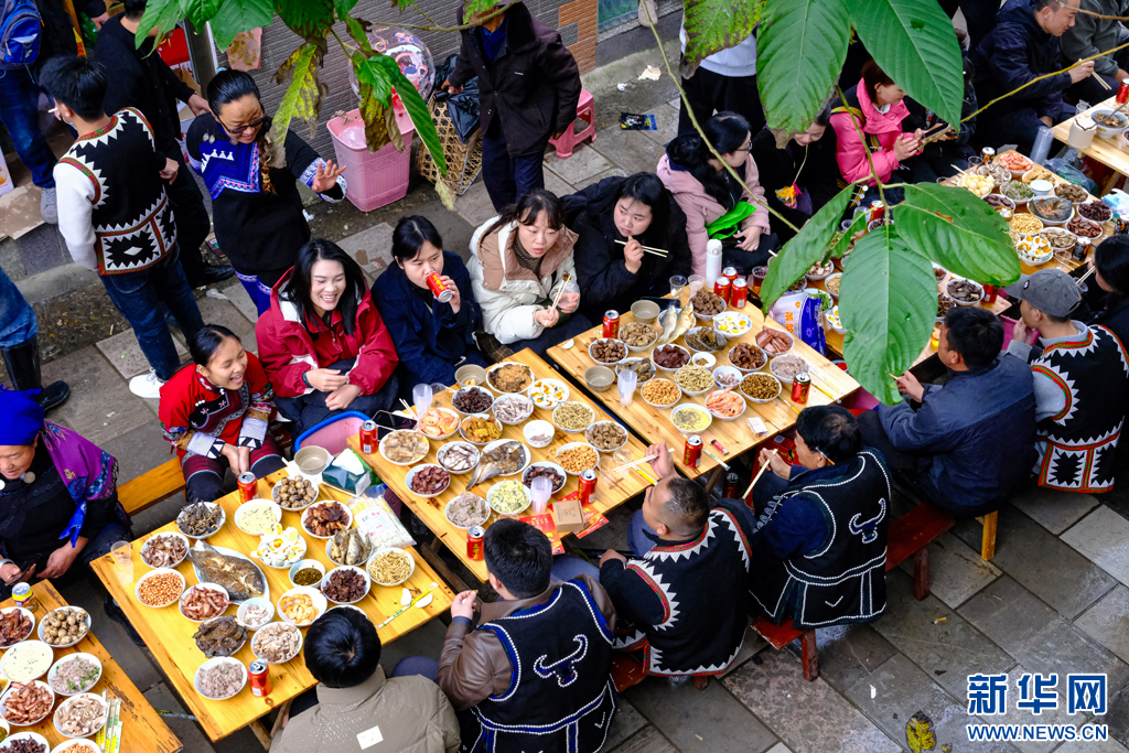 游客与村民一起体验哈尼长街宴(1月4日摄)。新华网发(张洪科 摄)