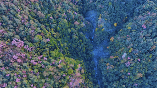 近日,在云南省腾冲市曲石镇青岩子,高山峡谷间大片野生冬樱花进入一年一度的盛花期。成百上千株野生冬樱花绽放,粉色的花朵装点在绿意之上,构成一幅唯美画卷。(完)(屈晓丽 刘正凡 张世东)