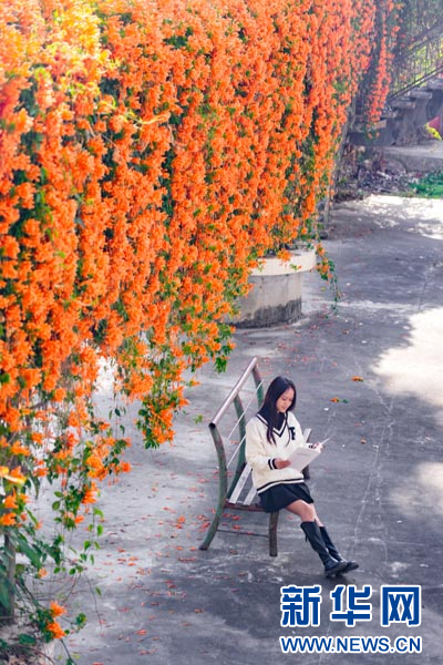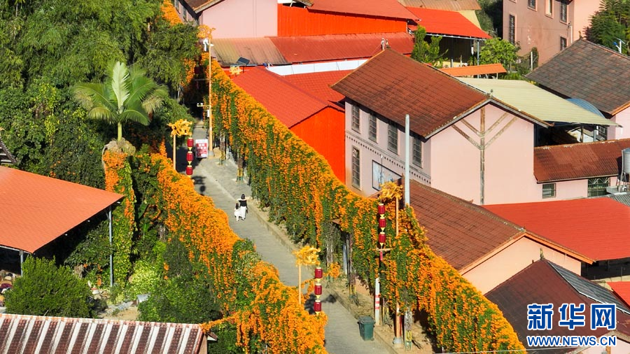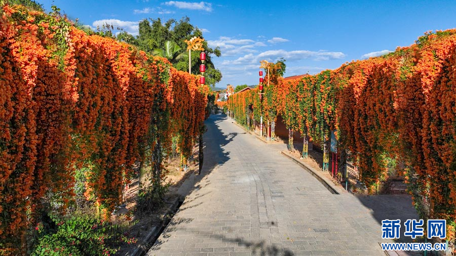 近日,在云南省陇川县龙安村,炮仗花沿着上百米的道路灿烂绽放,宛如两条橙红瀑布倾泻而下。微风吹过,花枝轻摇,橙红的花浪随风涌动,在阳光下显得生机勃勃。(完)(段宗智 方雯青)