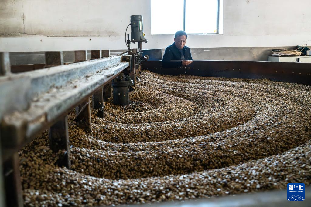 1月22日,咖农在临沧市临翔区圈内乡云佳咖啡庄园查看咖啡豆处理情况。新华社记者 高咏薇 摄