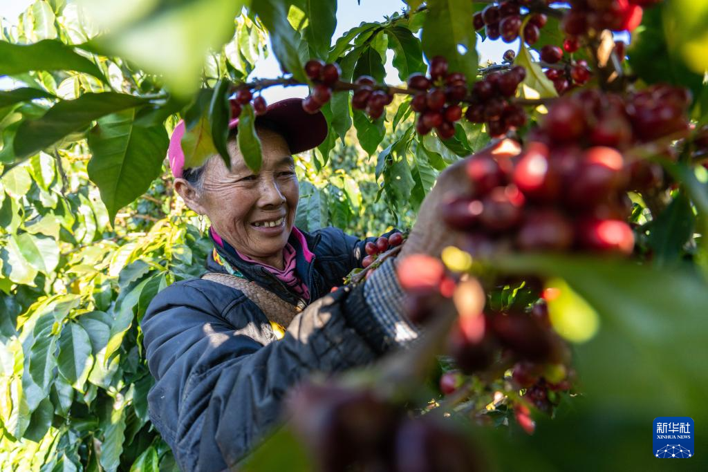 1月23日,咖农在临沧市双江县沙河乡陈家寨村云顶筑巢咖啡庄园采摘咖啡果。新华社记者 高咏薇 摄