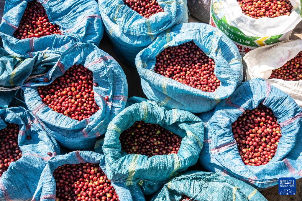 1月23日,咖农在临沧市双江县沙河乡陈家寨村云顶筑巢咖啡庄园晾晒咖啡豆。新华社记者 高咏薇 摄
