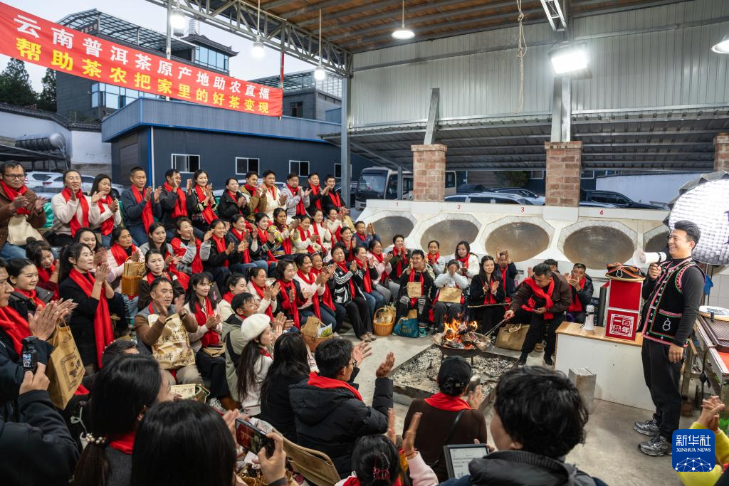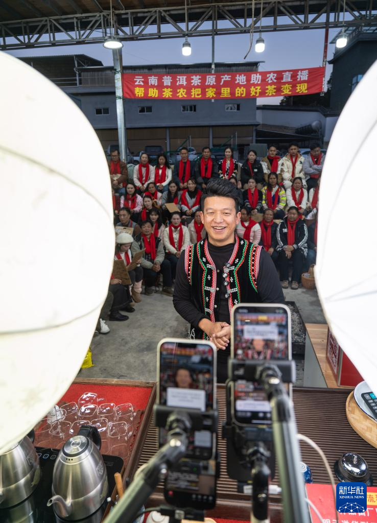 1月22日,茶农在临沧市双江县勐库镇参与茶叶推介直播。新华社记者 高咏薇 摄