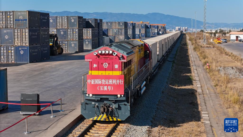 1月26日,中老铁路中亚国际货运班列在云南玉溪研和站发车。新华社记者 高咏薇 摄