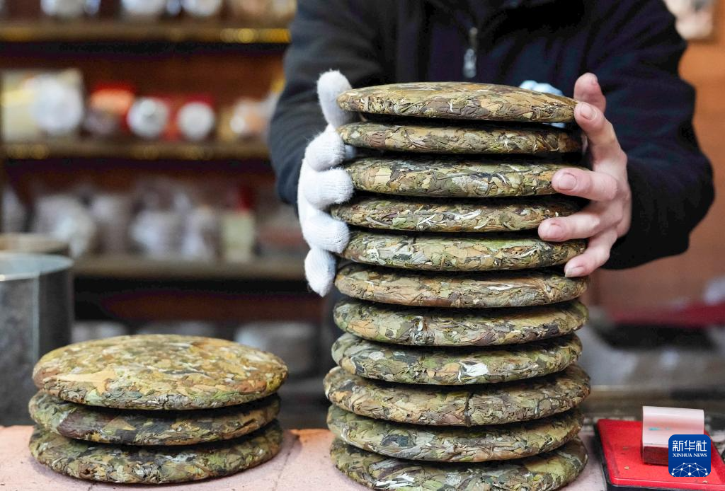 这是1月14日在那柯里村拍摄的普洱茶饼。新华社记者 陈欣波 摄