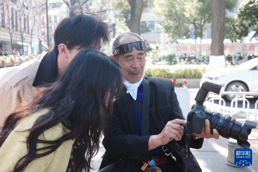 2026年1月27日,雷念龙向拍照的年轻人展示照片。(唐榕苓 摄)