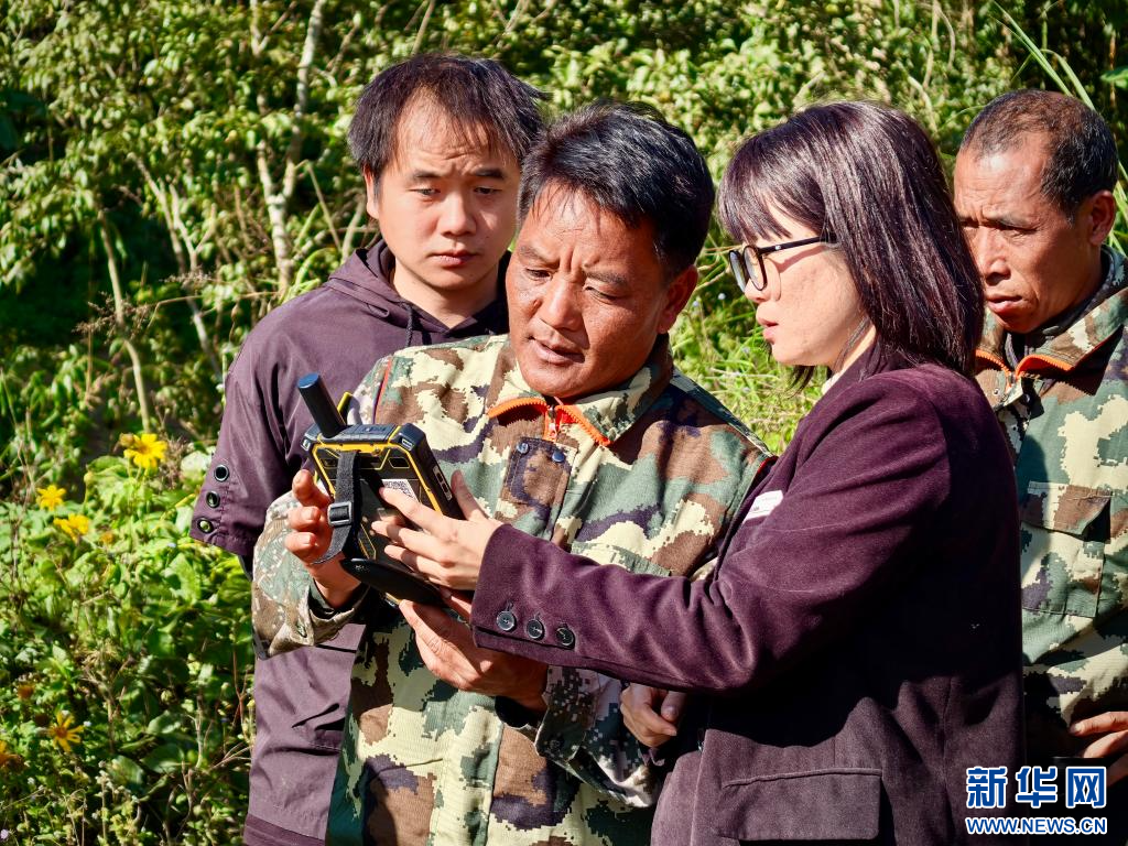 腊疯与勐海县林业部门工作人员一同运用云集林调通(林业测绘专用平板电脑)巡护。何沅蓉 摄