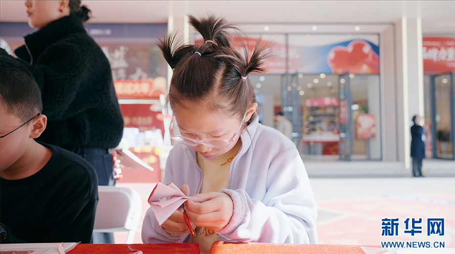 陈雪的女儿学习体验剪纸(2月1日摄)。新华网发