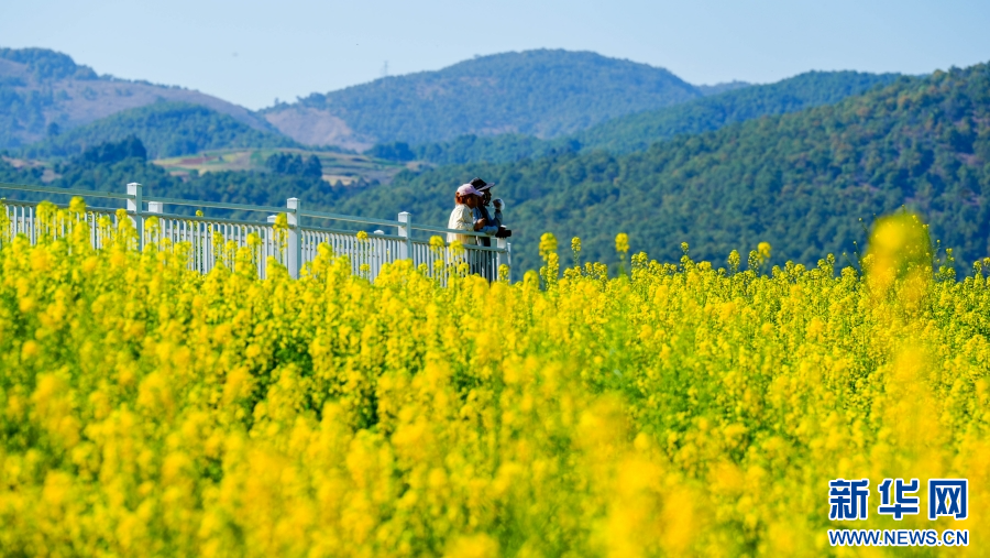 游客漫步油菜花田间(2月20日摄)。新华网发(黄申源 摄)
