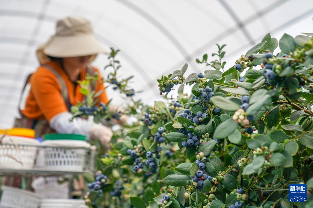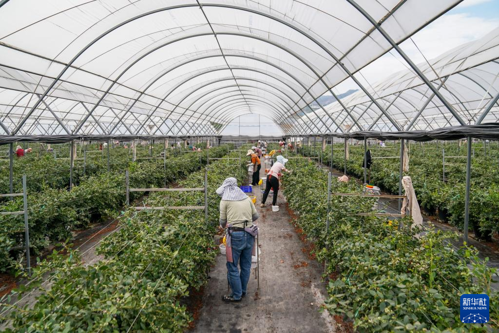 2月27日,工人在蒙自市一处蓝莓生产基地采摘蓝莓。新华社记者 彭奕凯 摄