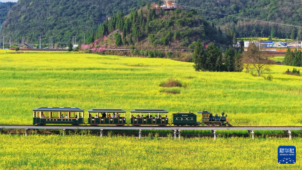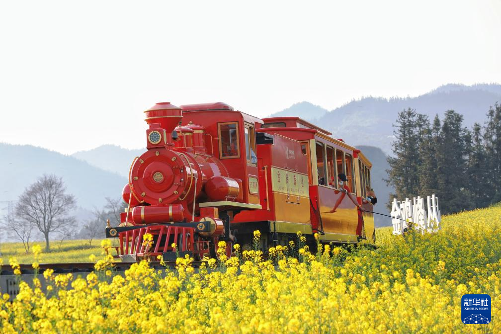 2月27日,在云南省曲靖市罗平县金鸡峰丛景区,观光小火车行驶在油菜花海中。新华社发(杨紫轩摄)