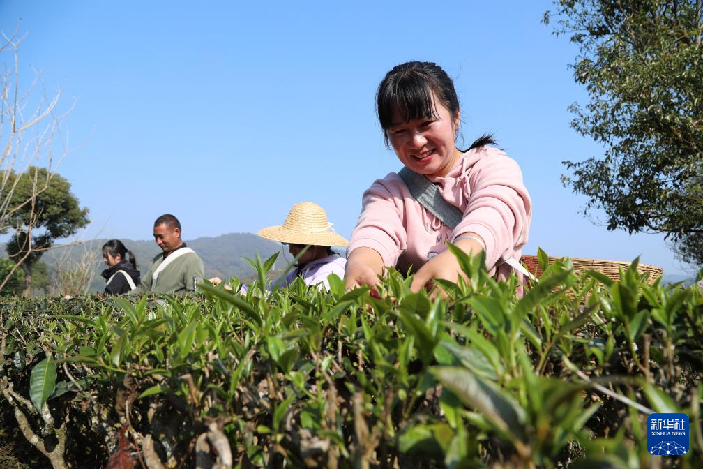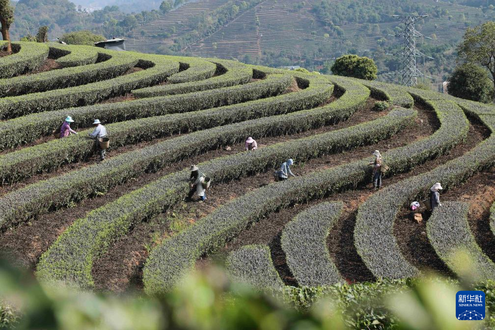 2月28日,茶农在云南省普洱市宁洱哈尼族彝族自治县宁洱镇太达村茶园采摘春茶。新华社发(杨廷荣摄)