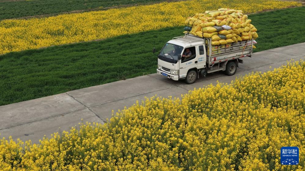 2月27日,在云南省曲靖市罗平县金鸡峰丛景区,观光小火车行驶在油菜花海中(无人机照片)。新华社发(杨紫轩摄)