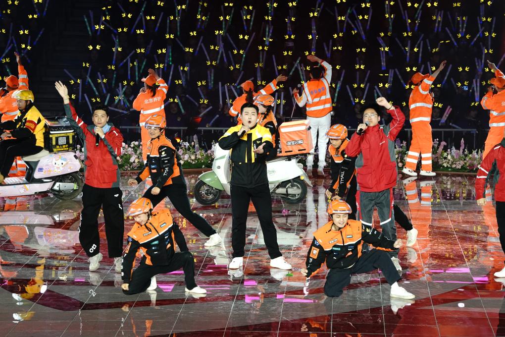 3月1日晚,几名快递员在舞台上表演。新华社记者 陈欣波 摄