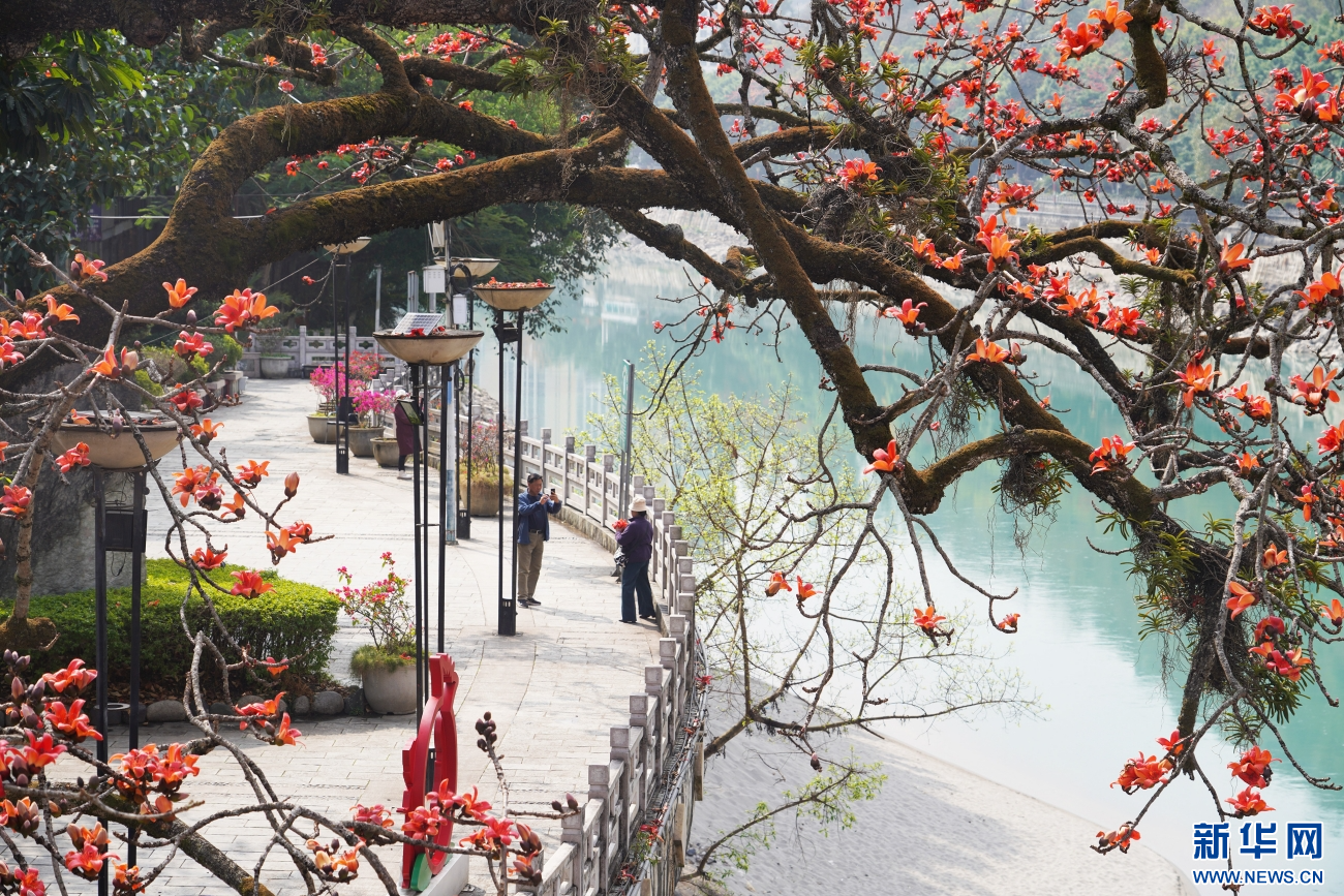 2月27日,市民在云南省泸水市六库街道欣赏、拍摄火红的木棉花。新华网发(杨海鹏 摄)