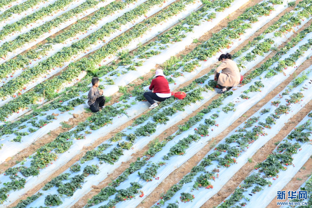 3月1日,云南省文山市黑卡村,家长带着孩子采摘草莓。新华网发(徐文尚 摄)