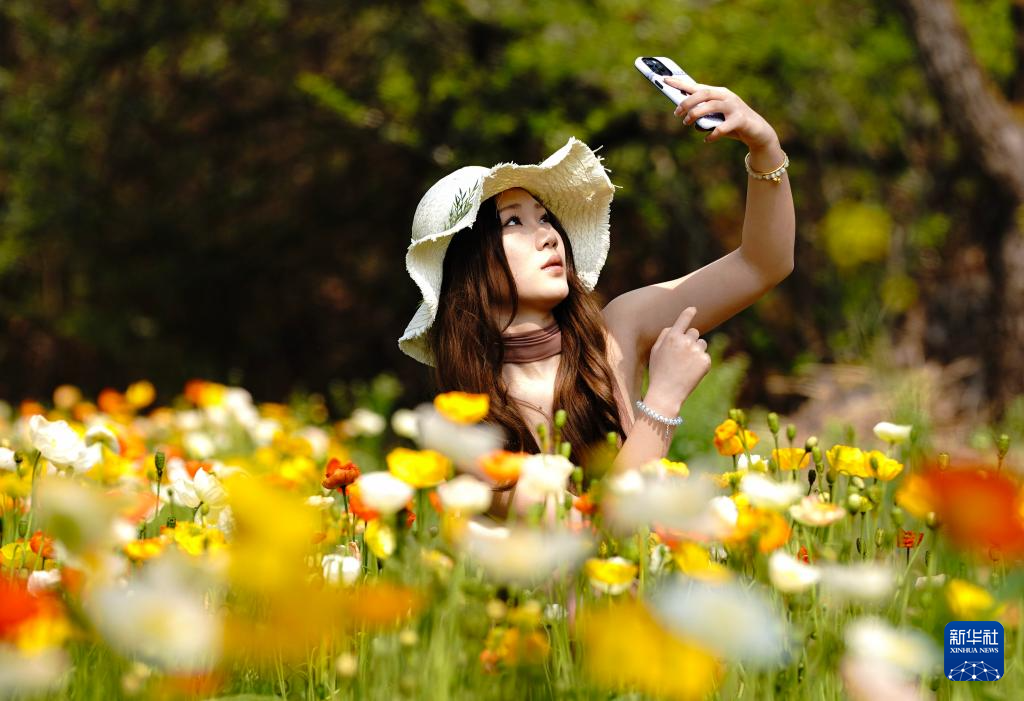 3月10日,一名游客在昆明名花谷的虞美人花丛旁拍照。新华社记者 陈欣波 摄