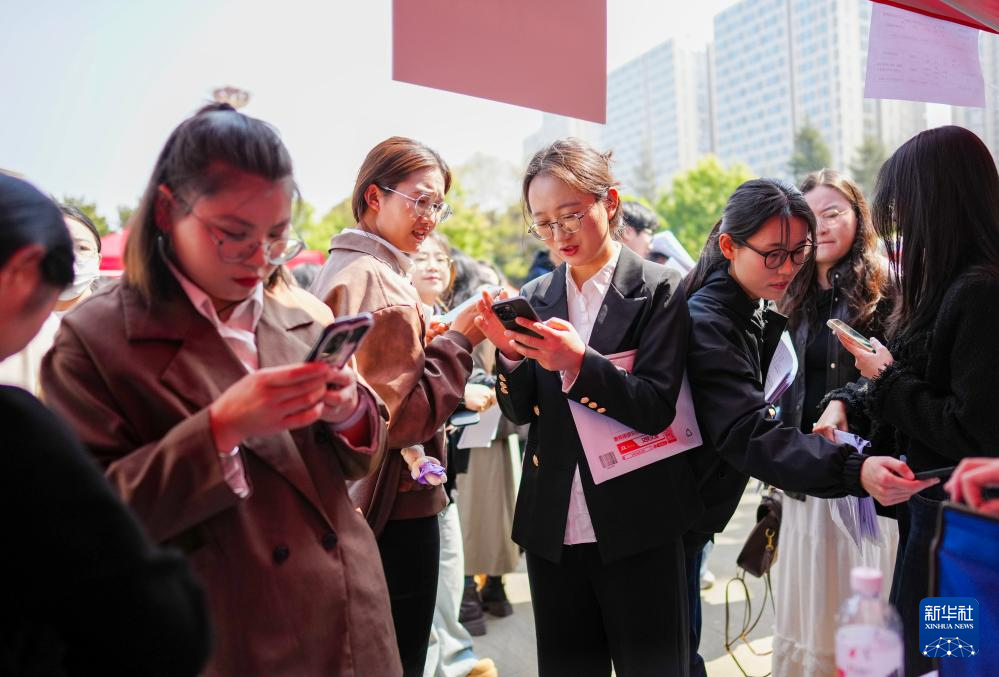 3月11日,求职者在招聘会现场通过手机填报求职信息。新华社记者 陈欣波 摄