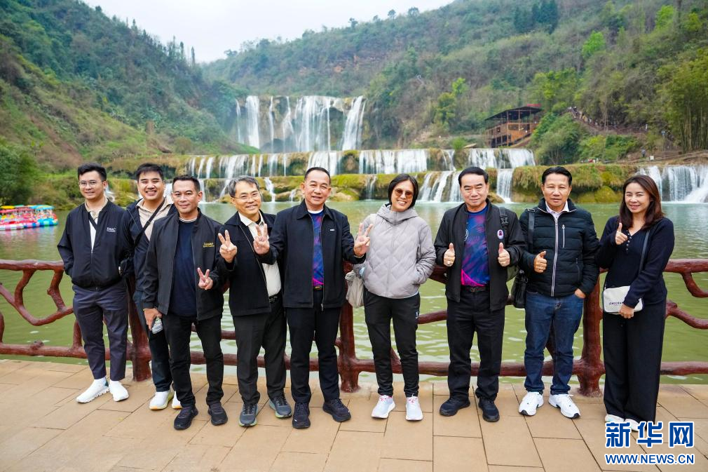 3月14日,参加2026曲靖罗平花海马拉松的泰国清迈代表团成员在罗平九龙瀑布参观留影。新华社记者 陈欣波 摄