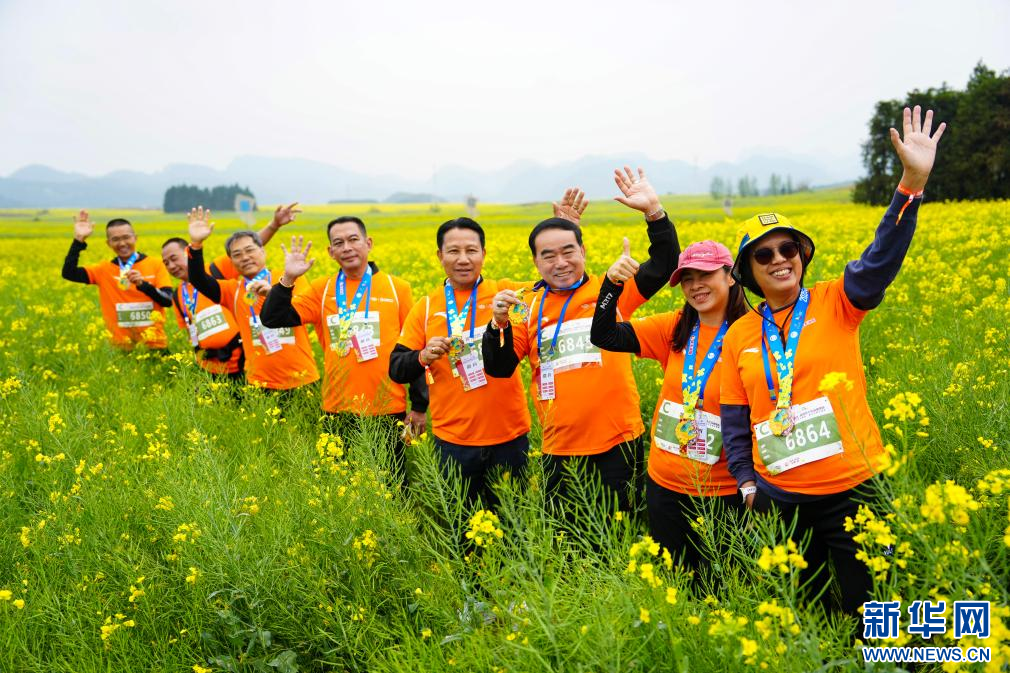 3月14日,参加2026曲靖罗平花海马拉松的泰国清迈代表团成员在油菜花丛中合影。新华社记者 陈欣波 摄