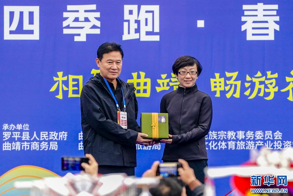 3月15日,在2026曲靖罗平花海马拉松上,中泰双方代表交换礼物。新华社记者 陈欣波 摄