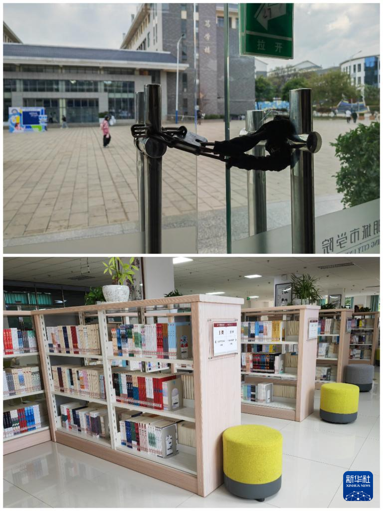 昆明城市学院下午4:30后上锁的教学楼与暂停服务的图书馆。新华社记者 岳冉冉 摄