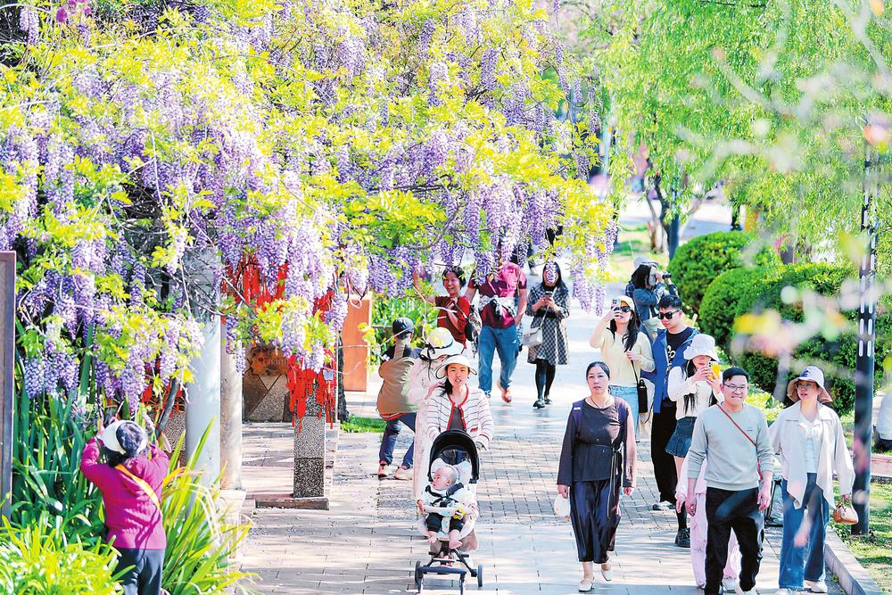 春日,昆明大观公园内,紫藤长廊、近华浦及庾园一带的紫藤垂挂藤架,盛放如瀑,与园中的古亭、白墙相映成趣,吸引市民游客纷至沓来,驻足观赏,拍照留影。(记者 胡妤雅 摄)