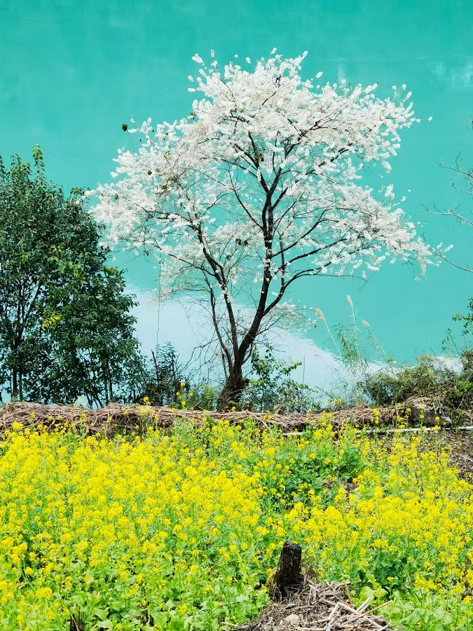 漫步云南省怒江傈僳族自治州贡山独龙族怒族自治县捧当乡,桃花与樱花竞相绽放,碧绿的江水宛如一条灵动的丝带,蜿蜒穿过山间,两岸青山倒映其中,山水相依,构成了一幅如诗如画的美景。(完)(段婷)